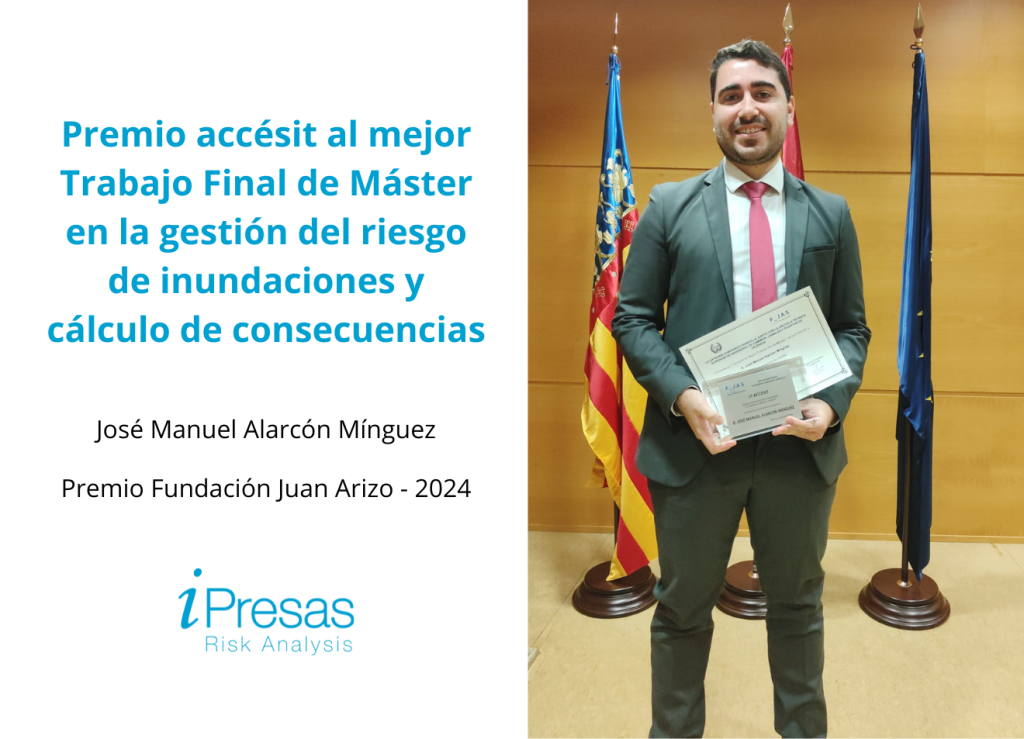 El pasado jueves 12 de diciembre, nuestro compañero José Manuel Alarcón recibió el premio de la Fundación Juan Arizo Serrulla: impulso a la excelencia por su Trabajo Final de Máster, que se enmarca en el ámbito de la gestión del riesgo de inundaciones y el cálculo de consecuencias.